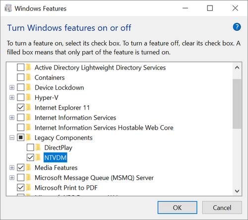 In Windows 10 (32-bit), this setting is found under “Turn Windows features on or off”, “Legacy Components”, “NTVDM”.